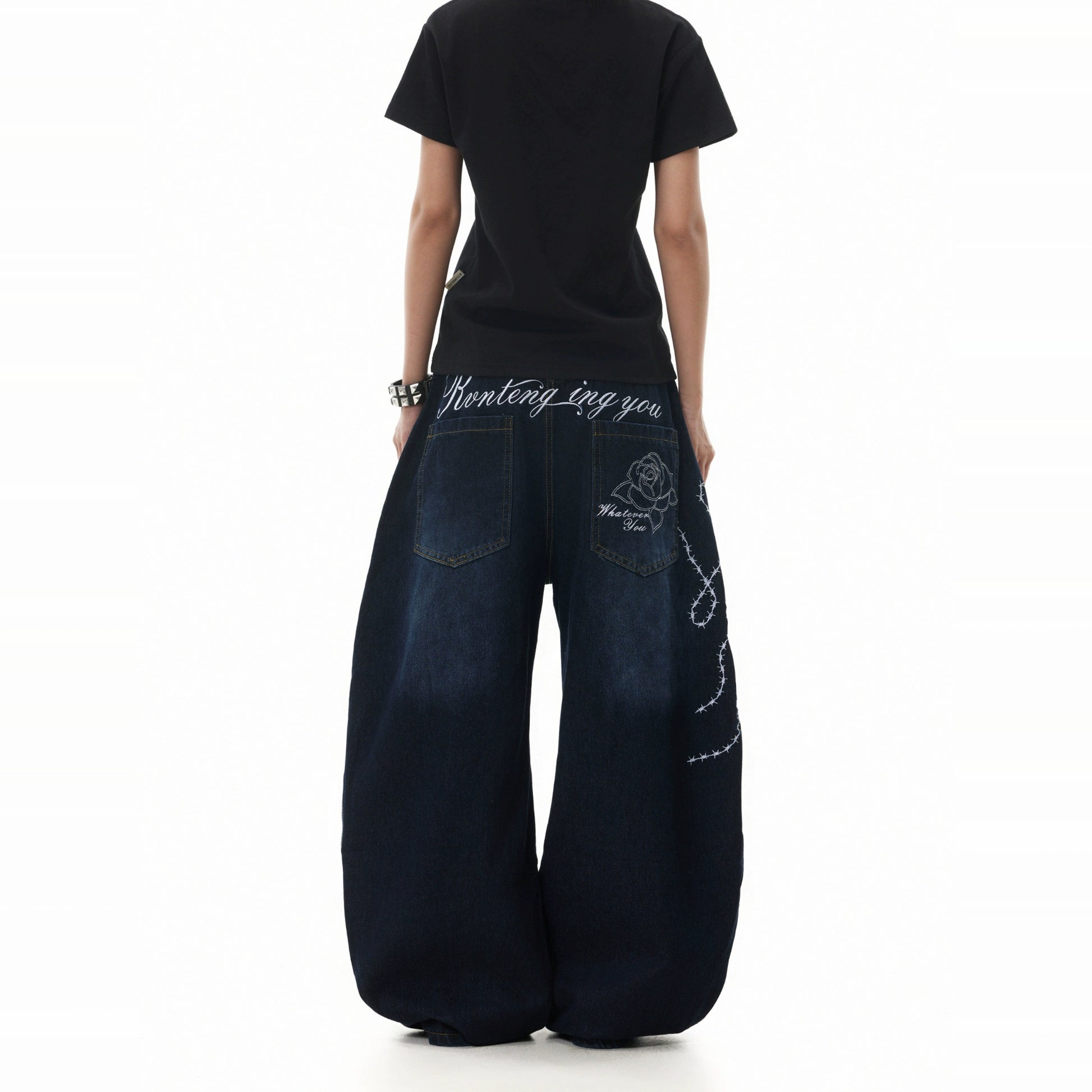 BACK PRINT LIGHTNING WASH DISTRESSED BAGGY DENIM PANTS
