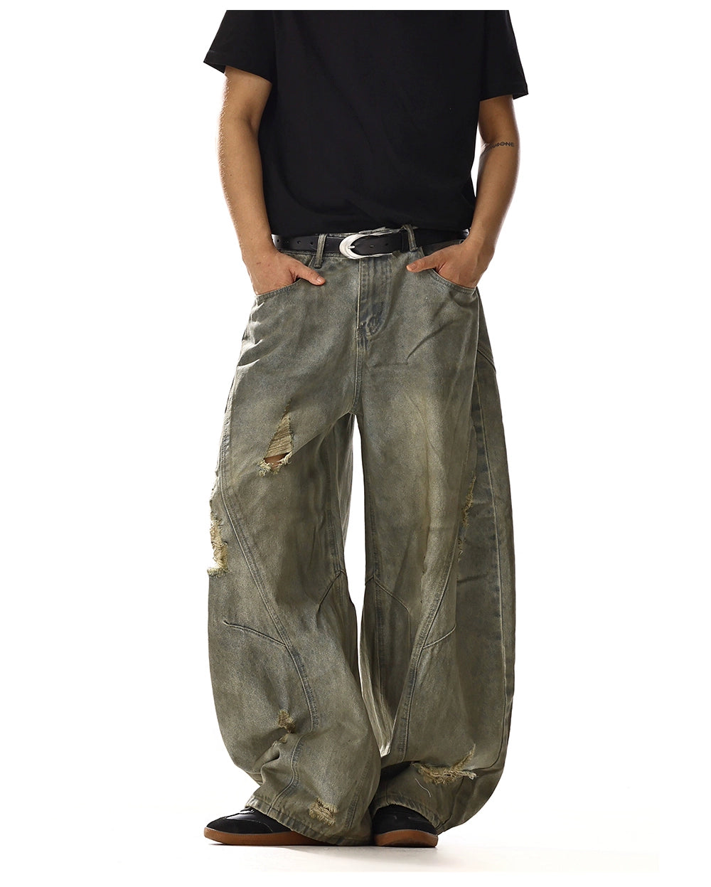 RETRO WASHED DISTRESSED RIPPED DAMAGE DENIM PANTS